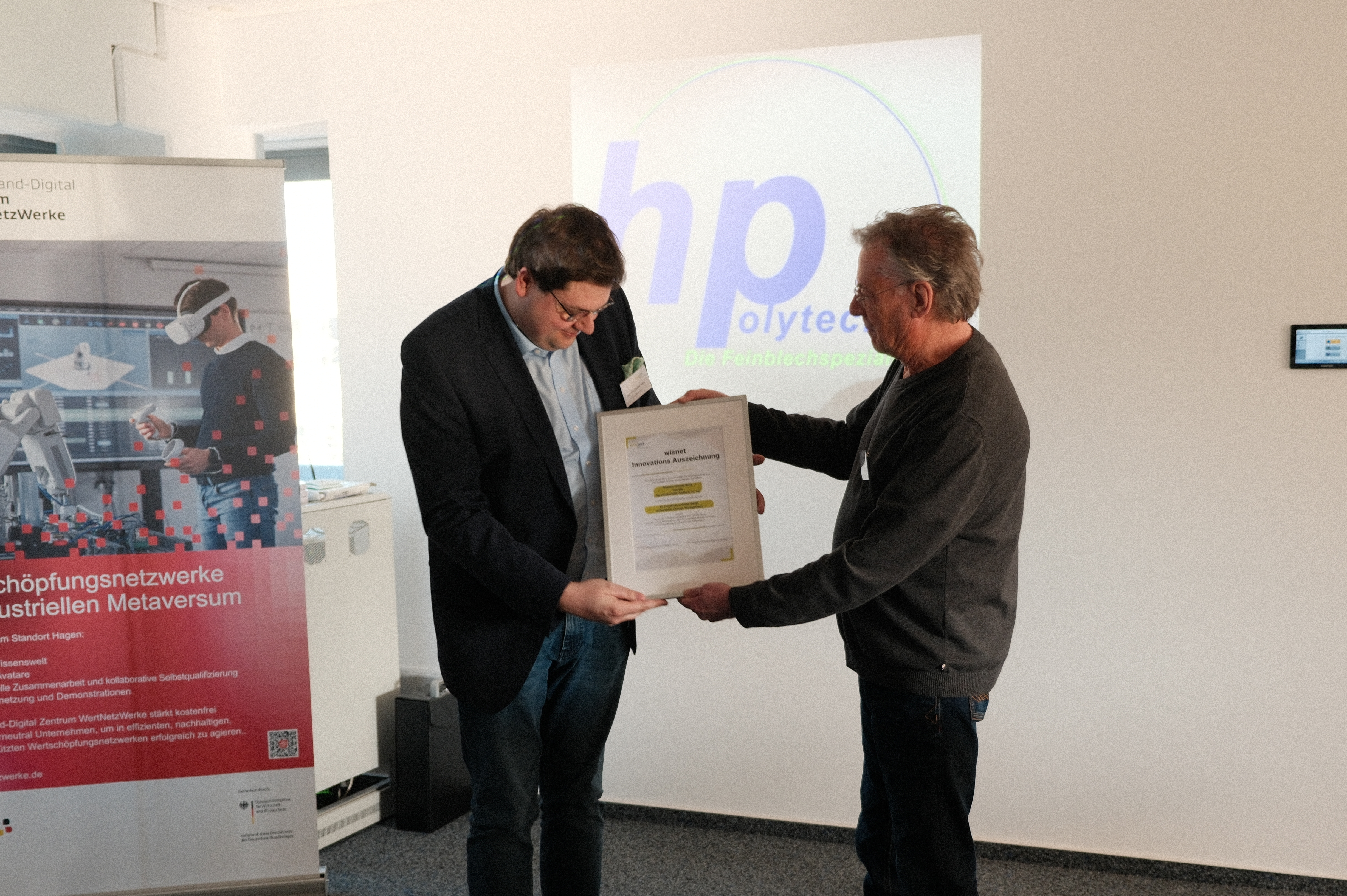 Im Rahmen des Innovation Day wurde der wisnet Innovation Award an Dominic Florian Rose, Geschäftsführer der hp Polytechnik GmbH & Co. KG in Iserlohn, verliehen.